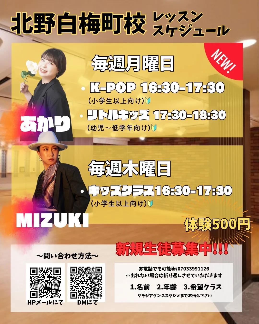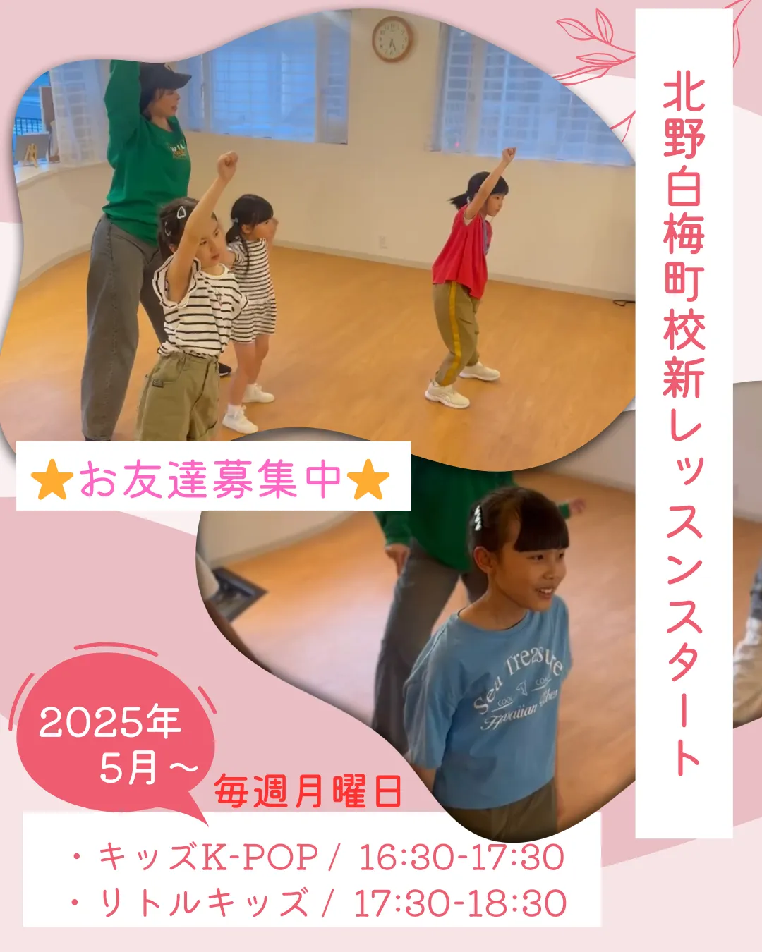 北野白梅町校では、2025年5月より、あかり先生による《キッズK-POPクラス》及び《リトルキッズクラス》を新しく開講させて頂く運びとなりました☺️