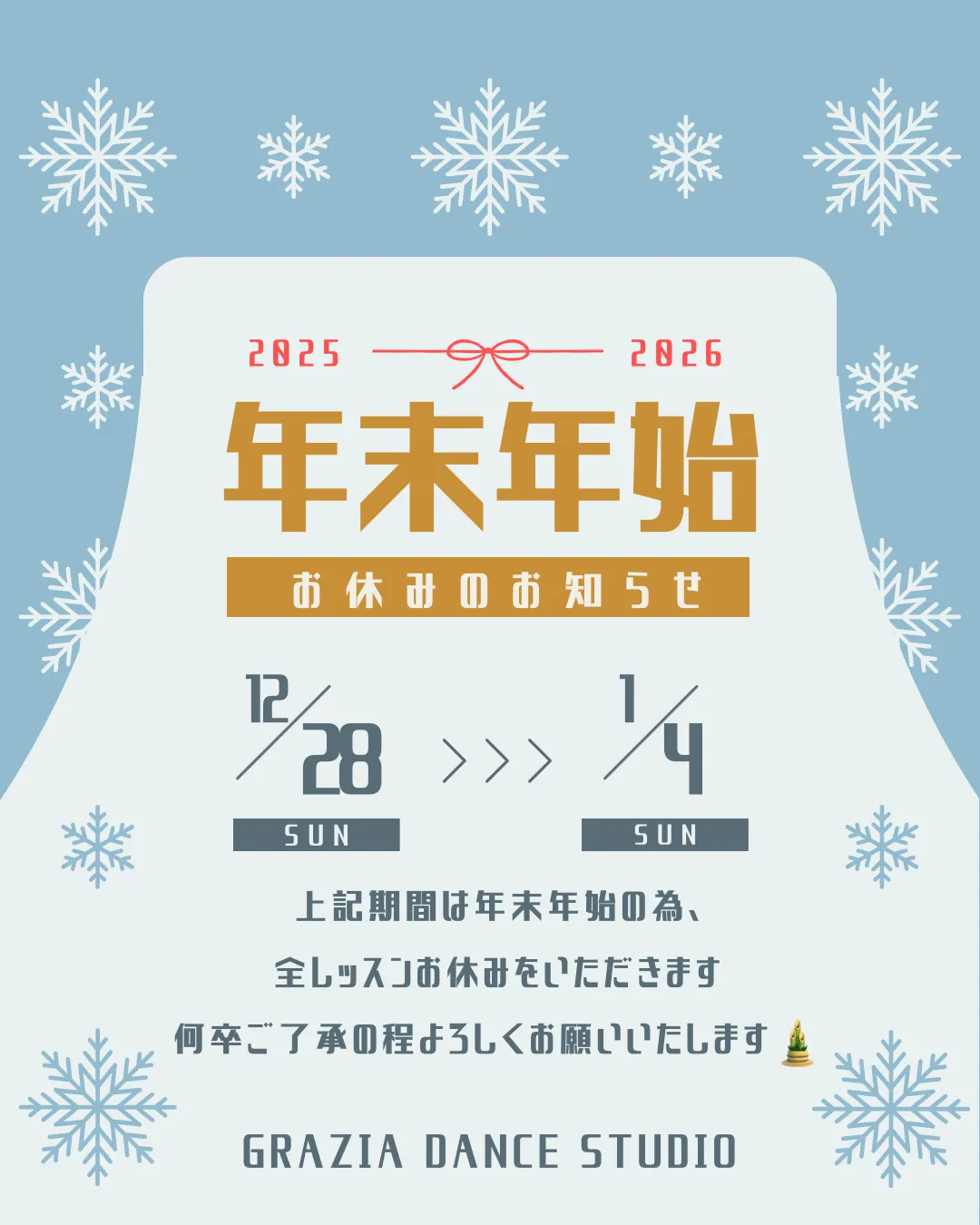 グラジアダンススタジオでは年末年始の為、2025年12月28日(日)〜2026年1月4日(日)まで全レッスンお休みをいただきます😌